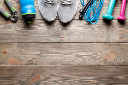 Flat lay shot of Sport equipment. Sneakers, water, earphones and phone on wooden background