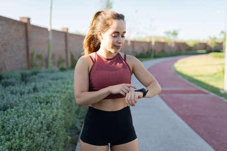 Sporty Caucasian woman checking time on smartwatch while working out in park