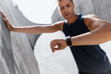 Young athletic man using fitness tracker or smart watch before run training outdoors. Close-up photo with dark background.