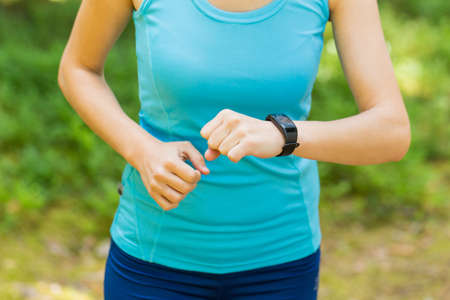 Close up shot of young woman setting and looking at sports smartwatch. Fitness female checking her performance.