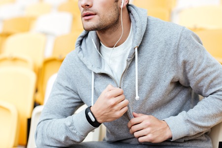 Cropped image of handsome young sports man at the stadium outdoors listening music.