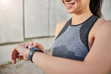 Positive delighted brunette woman looking at her smart watches while counting number of circles