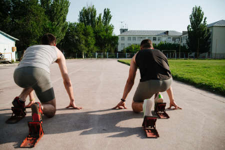 Male athletes sprinting. Two men in sport clothes run at the running track in professional stadium
