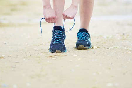 Close-up of female hands tying shoelace on running shoes before practice. Runner getting ready for training. Sport active lifestyle concept.