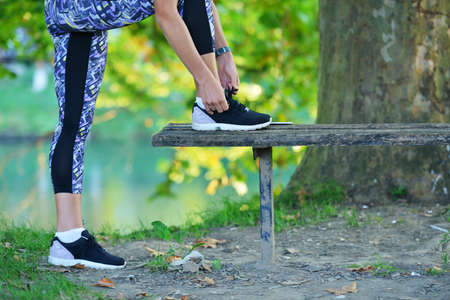 Runner girl tying laces shoes at the bench.