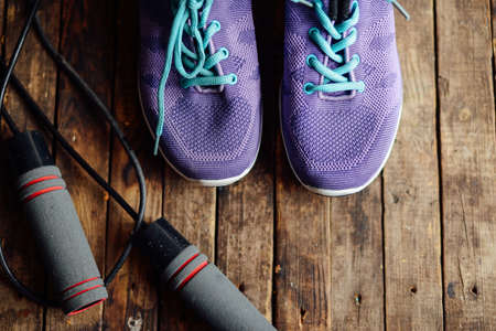 set for sports on wooden table, closeup. Rope and sneakers on the dark wooden background. Shoe on wooden background. Sport clothes and accessories on a wooden background, View from above