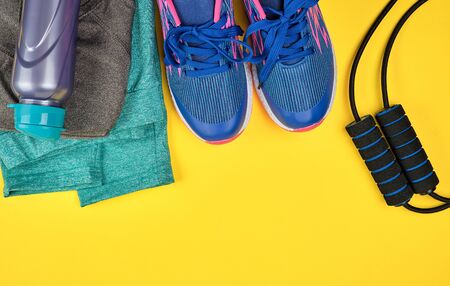 Blue women's sneakers and clothes for sports and fitness on a yellow background, top view, copy space, flat lay