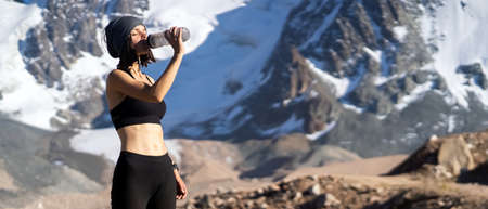 young woman in the mountains with a backpack drinks water. Active rest in one with nature