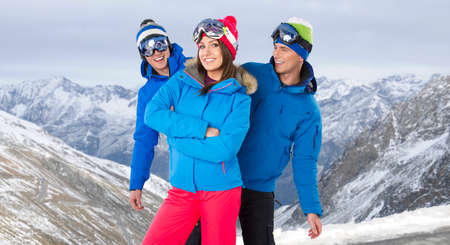 Friends gather in the snow, smiling and laughing while posing for a selfie. The bright sun shines over the scenic mountain landscape, creating a joyful atmosphere during ski trip. Generative AI.