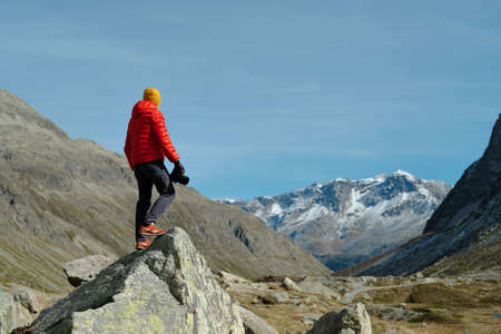 Back view of a tourist man in red jacket and camera standing with a view on Julier Pass, Switzerland