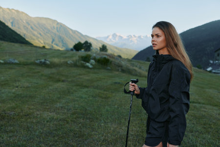 A focused hiker stands in a mountainous landscape with a trekking pole, wearing a black jacket. She gazes toward distant peaks, embodying adventure and resilience in a crisp outdoor scene.