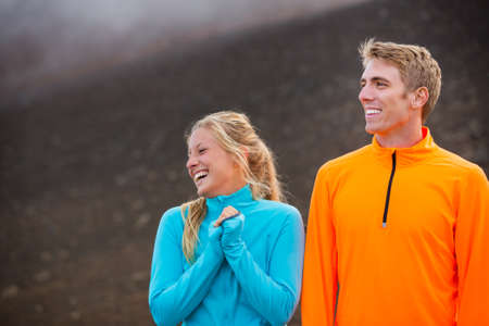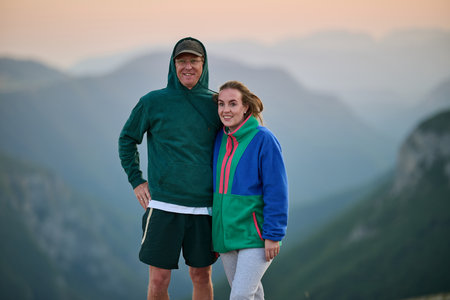 Happy couple posing outdoors on mountain at sunset, dressed in casual colorful hoodies, smiling and enjoying nature, travel, lifestyle, and togetherness in a scenic landscape