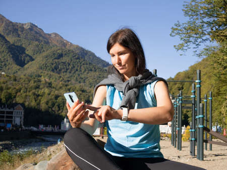 Woman trail runner set her smartwatch cross country running in winter mountains