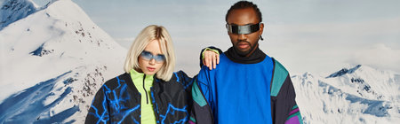 stylish couple in vibrant outfit with sunglasses posing on snowy backdrop, winter concept banner
