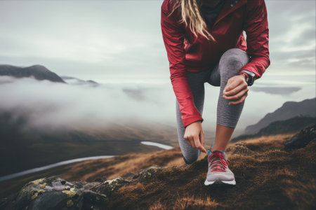 The Ultimate Fitness Journey: Runner's Smartwatch Woman Conquering High Cold Clouds Mountains