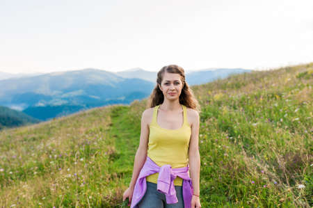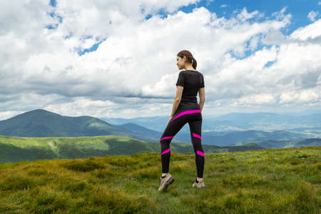 Sporty, happy girl on the top of the mountain. Tourism. Travels.