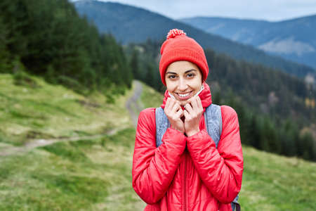 woman hiker with backpack, wearing in red jacket and orange pants, standing on the mountains and woods background, Western Ukraine.