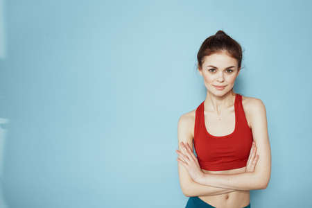 Sportive woman red tank top workout lifestyle gym blue background
