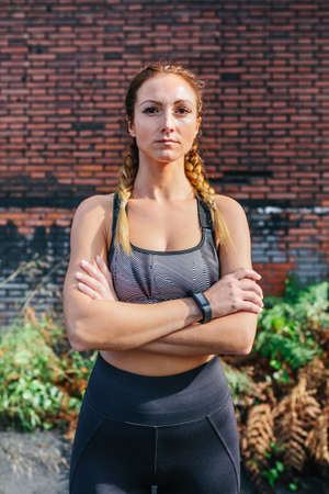 Sportswoman with crossed arms looking camera posing in front of a brick wall