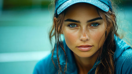 Close-up portrait of a sportswoman with a focused expression, wearing a visor and sports jacket, outdoors on a tennis court.