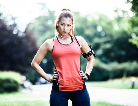 Portrait of a young fitness woman exercising in a park outdoors