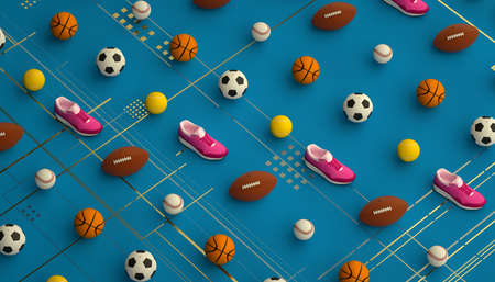 isometric sports fitness background made of soccer, football, tennis, baseball balls and colorful running sneakers. 3d render
