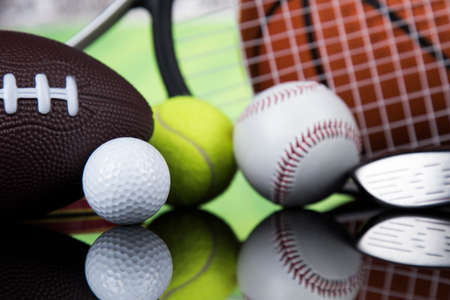 Sporting gear includes a tennis racket, football, dumbbell, and tennis ball, all set on a clean surface with room for text.