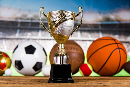 Mini balls of different sports and champion cup on green background. Minimalism Sport concept. top view. flat lay.