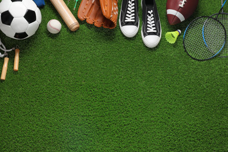 Sport games equipment - balls, sneakers, rockets - on grass top view copy space