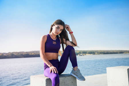 beautiful girl relaxing after morning gymnastics by the lake. health and beauty concept