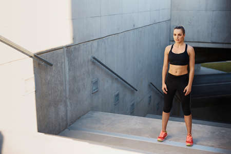 Portrait of young fit woman in sportswear exercising in city to stay healthy. People sport concept