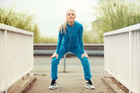 The blonde poses for the camera, in between workouts. Attractive athletic woman exercising outdoors in the morning, copy space. Health, fitness concept, copy space. close-up.