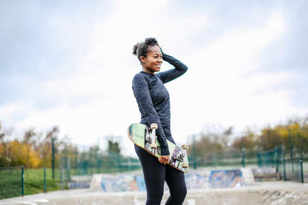 brunette african american woman in black sports bra standing near fence of stadium, banner