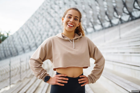 Portrait of attractive sport woman in sportswear posing outdoors at the stadium.young woman dressed in sportswear posing at the stadium on running track. Sport and healthy lifestyle.
