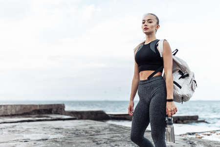Blonde fitness pretty girl with a towel and a bottle of water in sportswear near a dark metal wall in the city