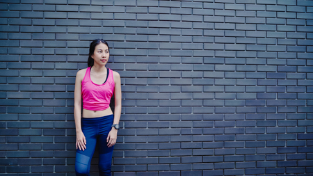 Young smiling female resting after an active fitness training while standing against gray wall with copy space area for your text message, satisfied fit woman resting after an active fitness training