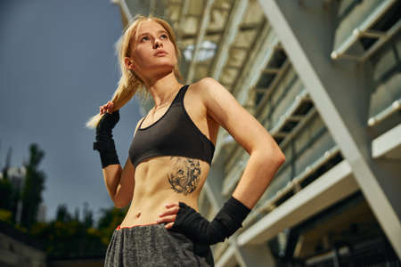 Cropped shot of athletic young woman who is dreming before kickboxing training while looking up sky