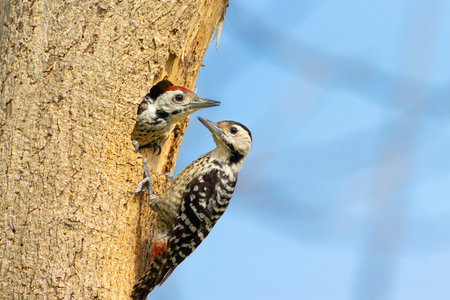Stripe-breasted Woodpecker feeding the chicks in the nest