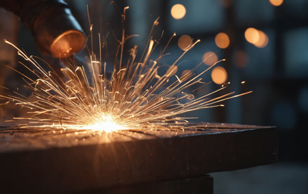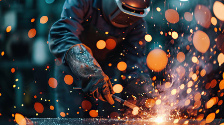 A proficient craftsman dons protective gear, skillfully fusing metal in a dimly lit workshop, where sparks and vibrant illumination define intense craftsmanship after hou