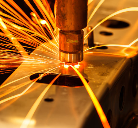 Plasma laser cutting on a cnc thick metal sheet, melting metal closeup