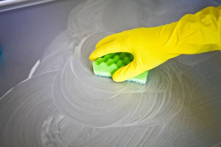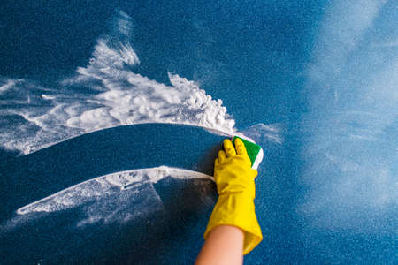 Hand of woman cleaning surface with sponge and foam