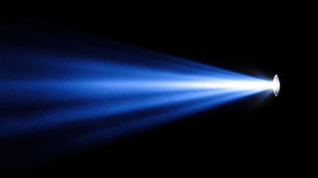 A strong spotlight casts a narrow beam of light in a dark environment, creating a dramatic effect. The light source is pointed upwards, enhancing the mysterious atmosphere.