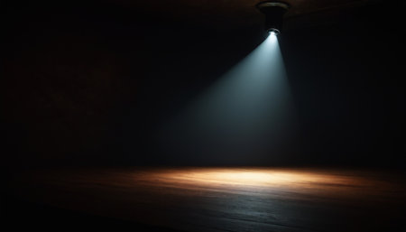 A single, warm spotlight cuts through the darkness, highlighting a section of a wooden floor on an empty stage.