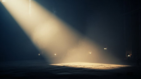 Spotlight illuminates dark space, casting beams of light that reveal particles in air, creating dramatic and atmospheric effect. scene evokes sense of mystery and intrigue