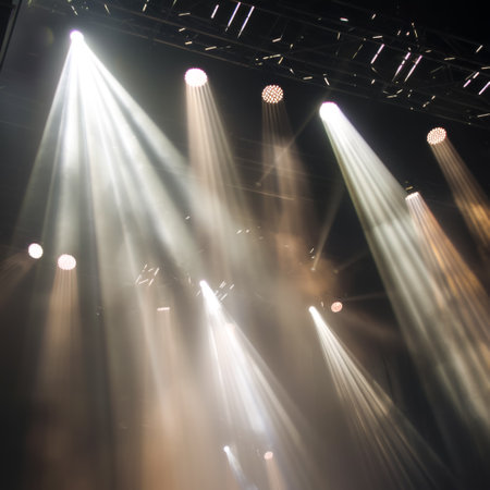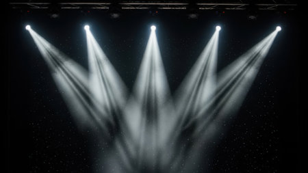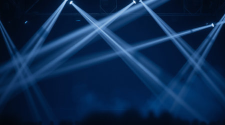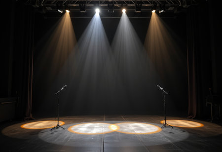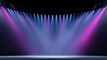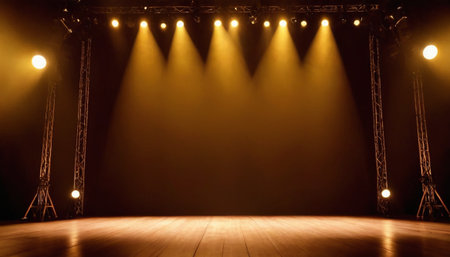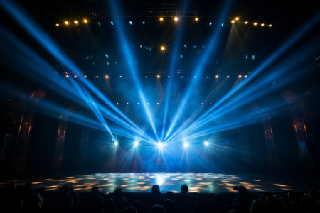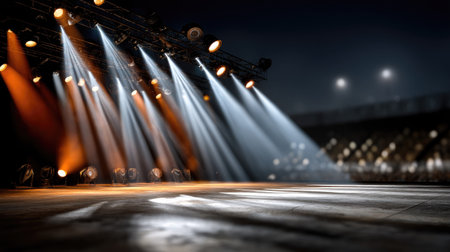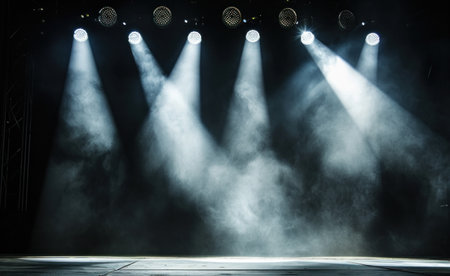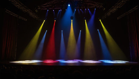 Captivating stage lighting creates a vibrant atmosphere with bright spotlights and dramatic shadows, setting the perfect scene for any live performance.