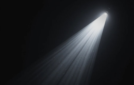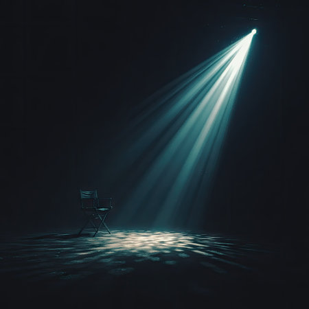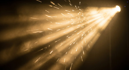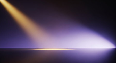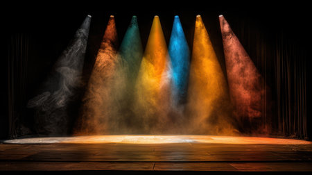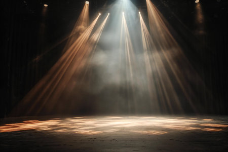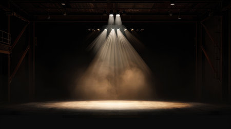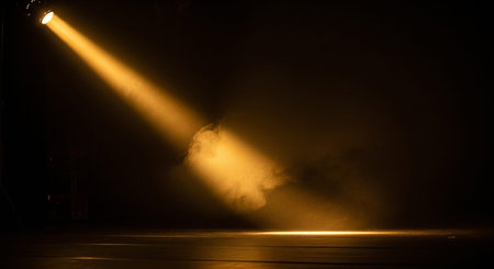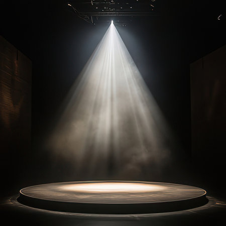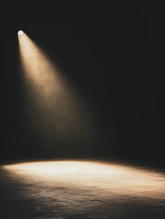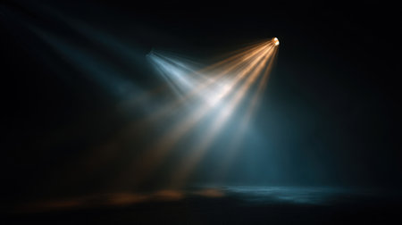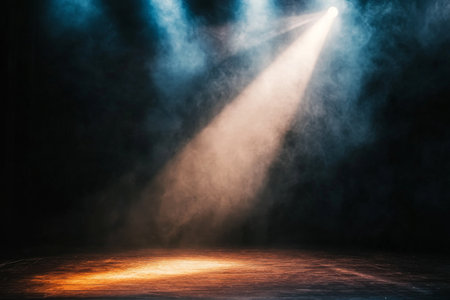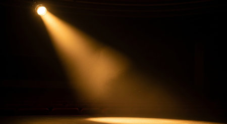 Spotlight beam illuminating dark stage, moody atmosphere. Theater lighting and performance concept