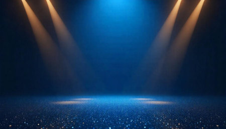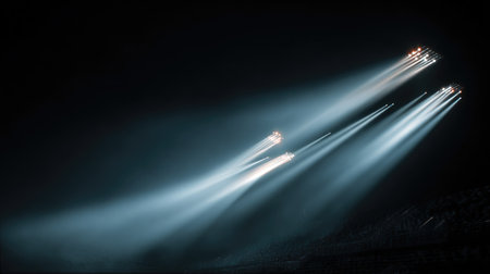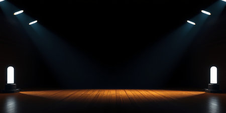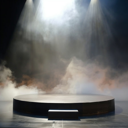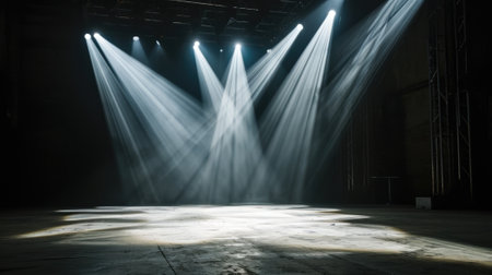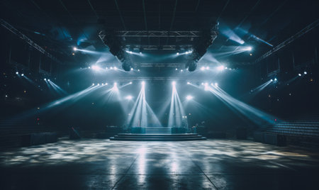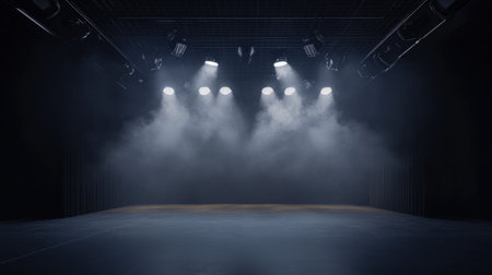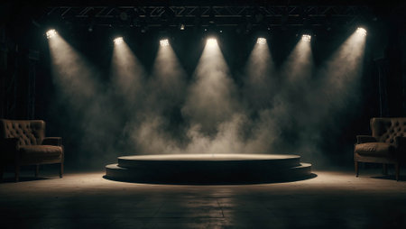 Dramatic stage scene featuring bright spotlights illuminating circular area on dark background, creating atmosphere of anticipation and excitement. soft haze adds depth and intrigue to setting