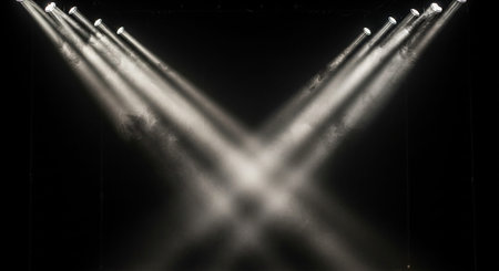 This image captures a dramatic scene of multiple spotlights converging on a stage. The beams of light create a striking visual effect, highlighting the intensity and focus of the stage lighting. The dark background contrasts sharply with the bright, concentrated beams, emphasizing the power and direction of the light. This setup is commonly used in theater, concerts, and other live performances to draw attention to the performers and create a captivating atmosphere.