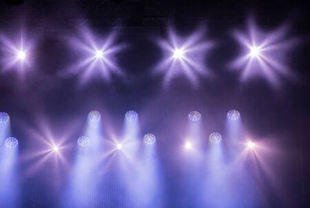 Stage lights. Several projectors in the dark. Purple spotlight strike through the darkness