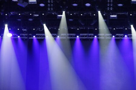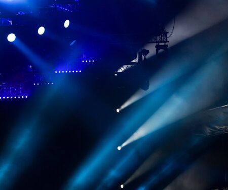 Concert spotlights.Blue and white rays of powerful projectors on stage